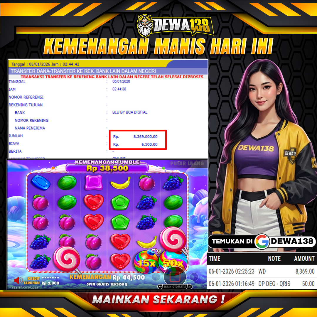 Cek sendiri DEWA138 tempat game jackpot dalam waktu singkat cuma di sini depo 50k bisa withdraw 8,3+ juta Sudah di kasih bukti bukan janji yakin ga main?Rugi Dong!